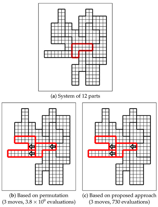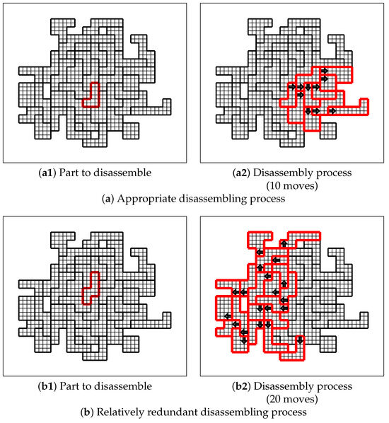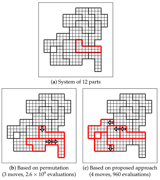 Figure 2 and Figure 3 show examples of randomly generated disassembling problems of 12 parts and their obtained disassembling processes. The red parts are the target part and the parts to be disassembled; the arrows in the parts indicate the disassembly moves. Figure 2b and Figure 3b are the optimal disassembling processes of minimum moves obtained by the permutation approach indicated in Section 2.3. Figure 2c and Figure 3c are the disassembling processes obtained by the proposed disassembling process inference.
