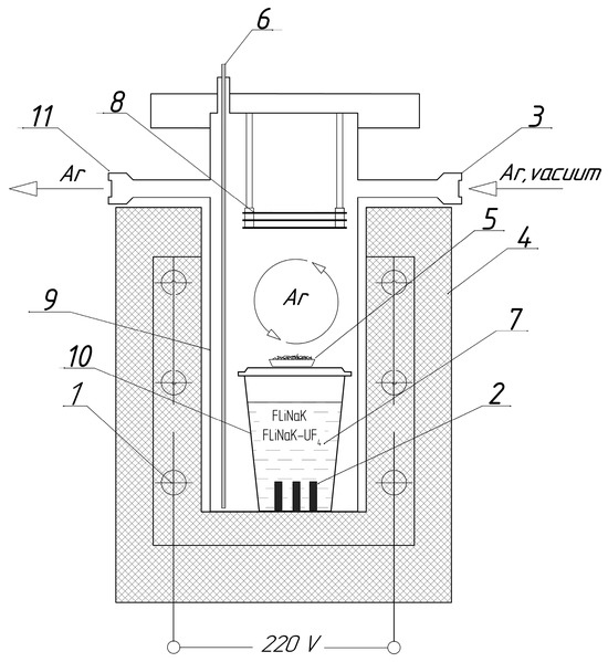 Experimental setup for corrosion experiments: (1) heating elements; (2) test sample; (3) gas inlet; (4) furnace; (5) titanium sponge getter; (6) thermocouple; (7) molten salt; (8) nickel heat reflecting screens; (9) steel cell; (10) crucible; (11) gas outlet.
