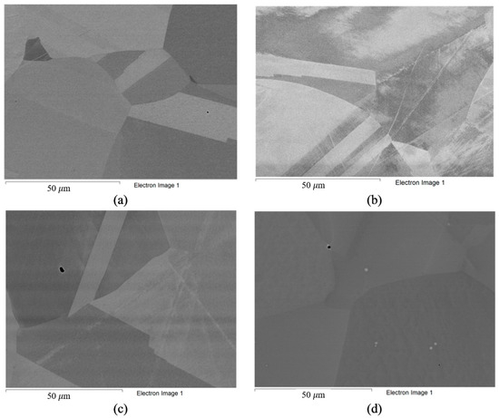 The composition of the alloys in their ‘as received’ state (according to the manufacturer’s data) is listed in Table 3. Analysis of the structure of the alloys in the initial state was also carried out (Figure 2). The microstructure of the Hastelloy® G-35® (Haynes, Kokomo, IN, USA), VDM® Alloy 59 (VDM─Metals, Werdohl, Germany), KhN62M-VI (RUSPOLYMET, Kulebaki, Russia), and Hastelloy® B-3® (Haynes, Kokomo, IN, USA) alloys in the ‘as received’ state represented a nickel-based fcc solid solution with a small amount of inclusions, which is typical for this class of materials [51].