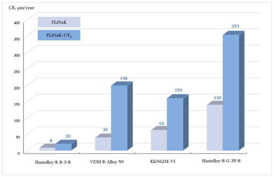 A series of 100 h corrosion tests of various nickel-based alloys (Hastelloy® G-35®, VDM® Alloy 59, KhN62M–VI, Hastelloy®B-3®) in FLiNaK and FLiNaK + UF4 melts was performed at 550, 650, and 750 °C. Corrosion indicators such as corrosion rates, depths of corrosion, and k-parameters were determined based on comprehensive analysis.