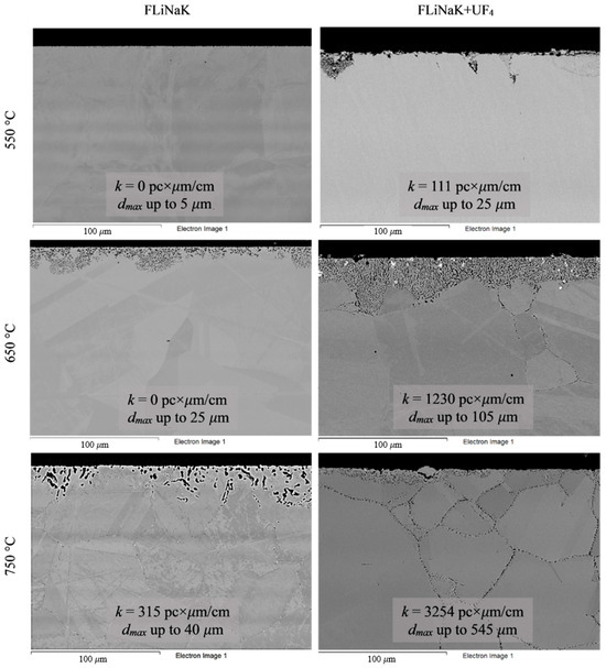 The corrosion rates and maximum damage depth (dmax) of the materials after 100 h corrosion tests in FLiNaK-based salt systems (with and without uranium tetrafluoride addition) at different temperatures are presented in Table 4 and Figure 3.