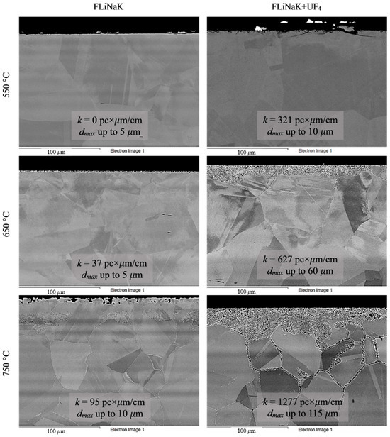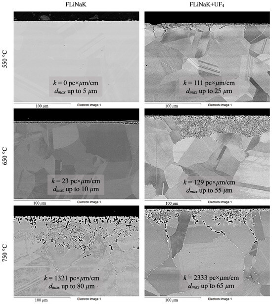 The corrosion rate measurements revealed three patterns common to all of the alloys: (a) the corrosion rate increased with increasing oxidizing capacity of the medium; (b) the corrosion rate increased with increasing chromium content in the alloys; and (c) the corrosion rate increased with increasing test temperature. In the first instance, uranium tetrafluoride increased the oxidizing ability of FLiNaK. Uranium is a polyvalent metal and capable of forming ions in different oxidation states in fluoride melts. Here, U(IV) can be reduced to U(III) in the presence of metals or alloy components. The redox potential of the U(III)/U(IV) couple in systems containing predominantly U(IV) is shifted to the region of positive values; therefore, the FLiNaK + UF4 salt system is more aggressive than pure FLiNaK. The second pattern is associated with the phenomenon of selective etching of more negative components from the alloy. In Ni–Cr–Mo systems, chromium is oxidized first [62,63,64,65,66,67]. On the other hand, increasing the temperature leads both to growth of the corrosion rate and formation of secondary phases at the grain boundaries, inducing IGC processes.