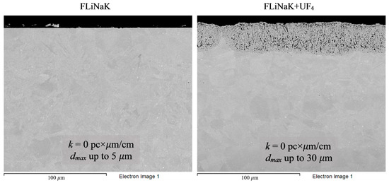 The concentrations of micro- and macro-components and the contents of impurities and corrosion products in the salt phase were determined using X-ray fluorescence analysis (ARL ADVANT’X 4200, ThermoFisher Scientific, Basel, Switzerland) and atomic emission spectrometry with inductively coupled plasma (Optima 2100DV, PerkinElmer, Wallingford, CT, USA). The oxygen content of the salt was determined by the method of carrier gas hot extraction (Horiba EMGA 620W/C, Horiba, Kyoto, Japan). The results from the chemical analysis allowed independent calculation of the corrosion rate values based on the mass fraction of corrosion products in the salt system (subsequently referred to as the chemical method, ChM).
