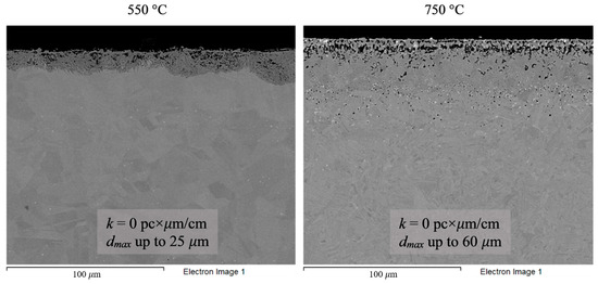 The corrosion experiments were performed at a temperature range of 550–750 °C using a custom-built setup that included a set of steel cells closed using water-cooled lids; each cell connected to a gas-vacuum system and was heated by an external resistance furnace. The tests were performed in a high-purity argon (99.9998%) atmosphere with controlled temperature and pressure inside the retort. The setup and the methodology for conducting ampoule corrosion tests were described in detail previously [47,48]. This setup allows long-term corrosion tests to be performed in various working media at elevated temperatures.