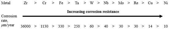 The chemical composition of excess phases can be used to roughly predict the role of the phase in the resulting microgalvanic system if we extrapolate the values of the corrosion rates of individual metals to the chemical composition of the excess phases. A separate series of corrosion tests was conducted with various individual metals (over 99% purity) in molten FLiNaK at 650 °C. The experiments were performed under the same conditions used for assessment of corrosion performance of the alloys. As a result, the corrosion resistance of individual metals was determined (Figure 10). Here, the corrosion rates were determined by gravimetric and chemical analysis methods; averaged values of the corrosion rates are presented in the figure. The results confirmed our previous conclusion that chromium and iron are the main corroding elements in the studied alloys. However, in case of alloys, rather than individual metals, the activity of components in the solid solutions (alloys), the presence of defects in metallic phases, and the formation of intermetallic compounds can affect the corrosion resistance of the elements. As a result, the corrosion behavior of the alloys’ components may in some instances deviate from the corrosion resistance row shown in Figure 10.