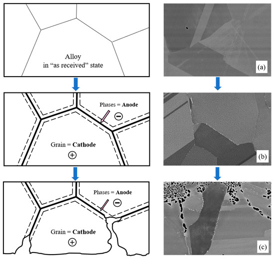 Schematic representation of the development of corrosion processes with the formation of microanodes at grain boundaries: (a) Microstructure of KhN62M-VI in its ‘as received’ state; (b) Microstructure of KhN62M-VI after exposure at 750 °C for 100 h; (c) Microstructure of KhN62M-VI after corrosion in FLiNaK + UF4 at 750 °C for 100 h.