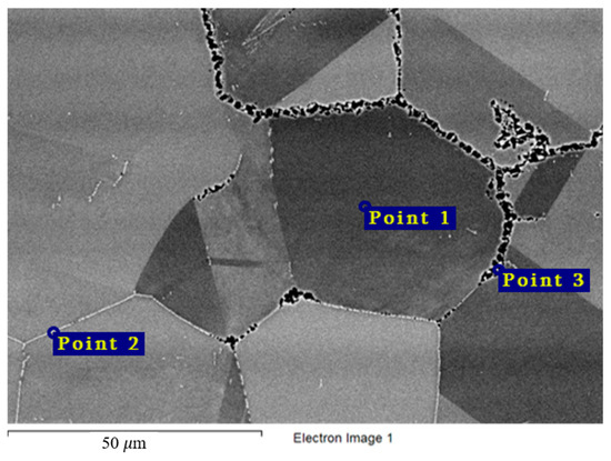 Similar observations were made for the VDM® Alloy 59 and KhN62M-VI alloys (Table 7 and Table 8, Figure 13 and Figure 14). Excess phases (Point 2) were significantly enriched in chromium, and localization of corrosion processes along the grain boundaries was observed for all samples (Figure 5 and Figure 6). The composition of the secondary phases indicates that these phases acted as microanodes.