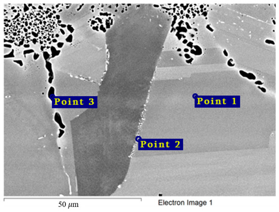 Figure 12 and Table 6 show the chemical composition of secondary phases (Point 2) in the Hastelloy® G-35® alloy and grain composition (Point 1), which corresponds to the content of main components in the bulk of the material. Excess phases in this case are significantly enriched in chromium, which points to the anodic nature of these microphases. Figure 4 shows the nature of the destruction of Hastelloy® G-35® alloy samples after 100 h of contact with FLiNaK and FLiNaK + UF4 melts. The alloy samples experienced pronounced intercrystalline damage, especially at 750 °C, which indicates the localization of corrosion processes along grain boundaries. The composition of the resulting secondary phases suggests that these phases acted as microanodes. The results of microanalysis in the destroyed grain boundary (Point 3) indicate significant chromium depletion in comparison to the bulk of the material, thus confirming the conclusion about selective dissolution of chromium-enriched secondary phases, i.e., microanodes, upon the contact with molten salt. It should also be noted that the total sum of the elements determined in the crack zone (i.e., point 3 in Figure 12) was below 100%. This was caused by the mounting resin penetrating the crack and filling the damaged zone, and thus adding non-metallic elements to the total count of the analysis. Similar deviation from 100% was observed in all subsequent samples, where damaged zones were analyzed.