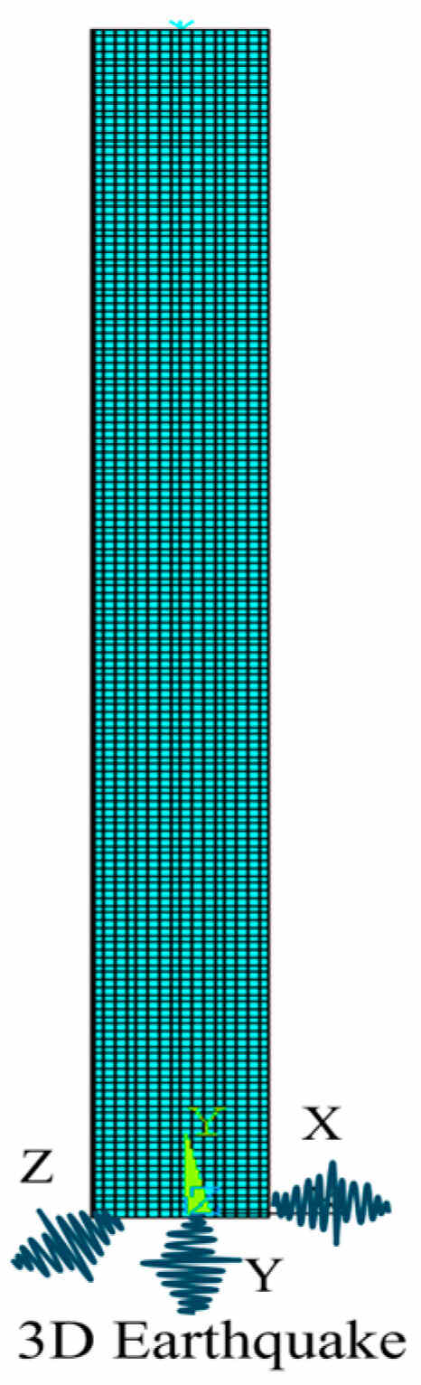 C40 concrete was selected as the primary material for the bridge pier, with a bridge pier section size of 4 m × 4 m × 40 m. A mass of 6.0 × 105 kg was added to the top of the bridge pier to simulate the impact of beams on the structure. According to the standard [23], the damping ratios of 3%, 5%, and 10% were selected. Table 1 displays the physical parameters of the concrete material utilized in constructing the bridge pier. Finite element modelling of the bridge pier was performed via ANSYS R21 software, where the bridge pier was represented by the Solide45 element and the added mass by the Mass 21 element. The boundary conditions constrain all degrees of freedom at the bottom of the bridge pier. The model included 46,529 nodes and 40,961 elements. This simulation aimed to assess the pier’s response to multidimensional ground motion, as shown in Figure 1. The technical route of finite element modelling method, finite element analysis, and concrete constitutive relation are strictly referred to from the literature [11,24,25,26]. The convergence of the mesh is analysed by comparing different mesh densities, and the errors of the first-order frequency and peak displacement under different mesh densities are compared. It is found that when the element number is 80,000, the error of the first-order frequency calculated by the finite element model with the element number of 40,961 calculated in this study is 0.03%, the error of the peak displacement is 3.5%, and the error value is less than 5%. Therefore, the mesh density used in this study ensures the balance of calculation accuracy and efficiency, and ensures the model is accurate and reliable. The shape is close to the finite element model in the literature [26], but the size parameters are very different.
