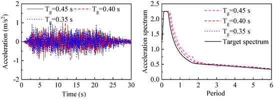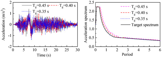 To simulate earthquake action, real second and third site conditions are considered. This study employed the ground motion synthesis software EQsignal v1.2.1, taking GB50011-2010 as the target spectrum. The characteristic periods were varied (Tg = 0.45 s; Tg = 0.40 s; Tg = 0.35 s), and three kinds of non-pulse ground motions and pulse ground motions were synthesized. The peak acceleration of non-pulse ground motions with different character periods were 1.0 m/s2, and the peak accelerations of pulse ground motions were 1.39 m/s2, 1.22 m/s2, and 1.40 m/s2, respectively, with a time interval of 0.01 s and a total time length of 30 s [27,28,29].
