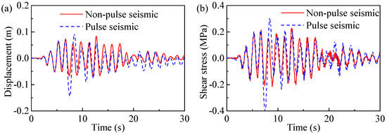 Time history curves of the response of tall bridge piers under pulse and non-pulse ground motion: (a) displacement and (b) shear stress.