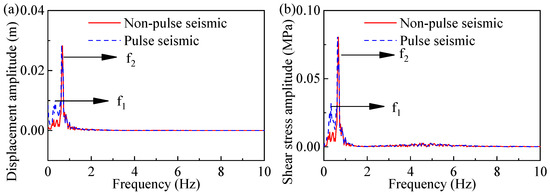 Frequency domain curves of the response of tall bridge piers under pulse and non-pulse ground motion: (a) displacement and (b) shear stress.