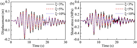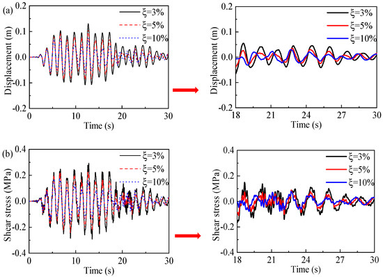 Time history curves of the response of tall bridge piers with varying damping ratios under pulse ground motion: (a) displacement and (b) shear stress.
