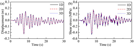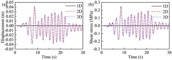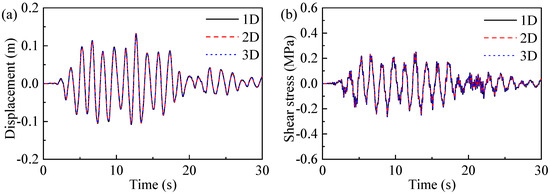 Figure 12 presents the displacement and shear stress responses of a tall bridge pier’s X section and XY section under multidimensional pulse ground motions, and a 5% damping ratio was selected. The peak displacements for the X section subjected to 1D, 2D, and 3D ground motions are 2.4497 × 10⁻12 m, 0.0416 m, and 0.0416 m, respectively. The corresponding peak shear stresses at the XY section are 1.5259 × 10⁻11 MPa, 0.2470 MPa, and 0.2468 MPa. These results highlight the significant increase in both peak displacement and shear stress in the XY section under multidimensional ground motions, and emphasize the need to consider multidimensional seismic effects in the service and analysis of tall bridge piers.