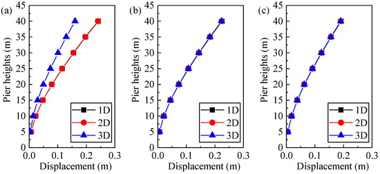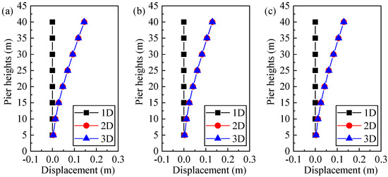 Figure 13 and Table 4 show that the peak displacement at the X section of tall bridge piers increases with pier height under three-dimensional ground motion. In addition, the displacement under two- and three-dimensional seismic action is significantly greater than that under one-dimensional motion action, emphasizing the need to consider multidirectional seismic effects in structural evaluations. In this study, torsional or biaxial bending effects in three-dimensional motion are not considered. According to the seismic design code, the load applied in the main load direction is large, and the structural symmetry makes the coupling effect negligible.