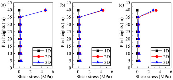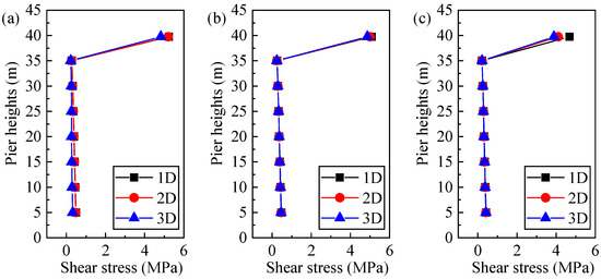 The variation trend of the XY section peak shear stress of tall bridge piers with different damping ratios under multidimensional pulse ground motion: (a) = 3%; (b) = 5%; and (c) = 10%.