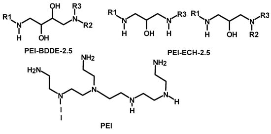 PEI is also crosslinked with other type of small molecules that possess an electrophilic carbon bonded to an electron-withdrawing elements such as chlorine. Such crosslinkers include dichloroethane, epichlorohydrin [], trichlorotriazine, and epoxy-containing crosslinkers ((such as glycerol diglycidyl ether [], ethylene glycol diglycidyl ether [], and 1,4-butanediol diglycidyl ether []) (Figure 2).
