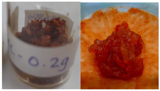 PEI was crosslinked with glutaraldehyde and glyoxal in the presence of hydroxypropyl methylcellulose (HPMC) in a typical beaker reaction at room temperature to yield an orangish-reddish crosslinked material (Figure 6). The resulting material was a jelly before it was put into an oven for drying. The crosslinked material was mixed with a copper ion-spiked water solution and stirred at room temperature to evaluate the copper binding capacity of the adsorbent material. The bulk crosslinked material was found to be efficient at removing copper ions from water within a short period of time. The study showed that the copper adsorption of the material was up to 350 mg g−1 for the crosslinked polymer, which has HPMC as an additive, and leached out later. However, the two other crosslinked polymers—one without HPMC but crosslinked with glutaraldehyde and the second materials crosslinked with glyoxal—showed a lower copper adsorption capacity. The adsorption of Cu2+ on the crosslinked PEI is best described by a pseudo-second-order kinetic model (Equation (4)), as revealed by the high R2 value of a linear plot plot of t/qt versus t. The material is also reusable for repeated adsorption batches after the release of adsorbed copper ions in 2% HNO3 [].