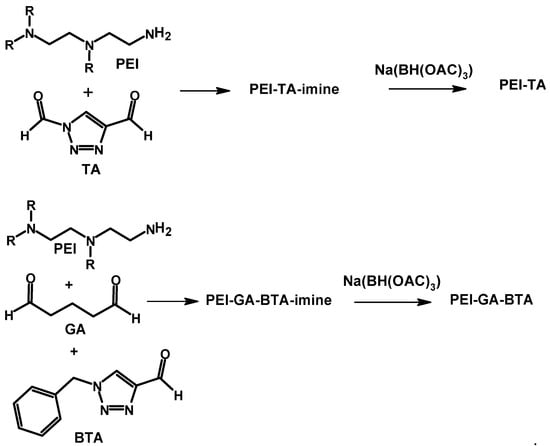 Crosslinking reaction of polyethylene imine with triazole-containing molecules and subsequent reduction of the imine bond [].