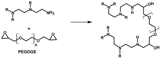 Naga et al. reported the crosslinking of PEI with PEGDGE (n = 9 and n = 23) (PEGDGE-400 and PEGDGE-1000) to yield a PEI-PEGDE gel in a reaction referred to be a ring opening addition reaction [,]. The reaction was conducted in DMSO (30 wt% of the monomers) as a solvent in the presence of PPh3 as a catalyst at 90 °C or just in water without the use of the PPh3 catalyst at room temperature to yield the gels. The materials were characterized with different techniques. In the IR study, the characteristic peaks of the epoxy ring at 800 cm−1 and amine group at 1500 and 1600 cm−1 disappeared, indicating the progression of the crosslinking reactions under the reaction conditions used. The gel formation times of PEGDGE-400 and PEGDGE-1000 were monitored using a viscometer at room temperature, revealing a shorter time for PEGDE400 as compared to its counterpart crosslinked material.