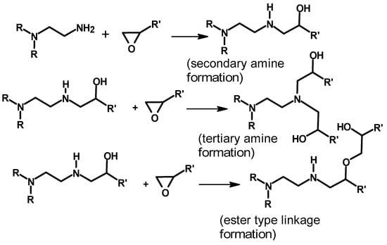 The crosslinking reaction involves epoxide ring opening and the formation of secondary amines, tertiary amines, and esters, as discussed by Narayanan et al. [] and Yoo et al. [] and shown in Scheme 6.
