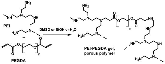 The synthesis of gels and porous polymers was achieved by an aza-Michael addition reaction of PEI with polyethylene glycol diacrylate (PEGDA) in DMSO, EtOH, or H2O, and reaction is shown in Scheme 7 []. Different molecular weight PEGDA samples were used (PEGDA200, PEGDA400, PEGDA600, and PEGDA1000).