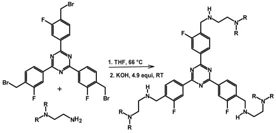 A crosslinking reaction of PEI is also possible using crosslinkers that have a leaving group, such as an sp3 C-Br bond. The crosslinking reaction proceeds via an amine alkylation reaction between the alkyl bromide of the crosslinker and the amine groups of the branched PEI, with bromine being substituted with amine functional group of the amine. Hamdy et al. used bromoalkyl phenyl attached to a triazene core unit as a crosslinker (2,4,6-tris-(4-bromomethyl-3-fluoro-phenyl)-1,3,5-triazine (4BMFPT)) for PEI, as shown in Scheme 8, for CO2 selective capture at ambient temperature []. Different materials with different mixing ratios of the crosslinker to PEI were synthesized. The materials prepared were characterized with IR, elemental analysis, and SEM, and the materials were tested for their performance in CO2 capture. It is important to note that the direct capture of CO2 from air is not facile, as a material with a high selectivity and strong reactivity with CO2 is required []. Hence, careful control of the reaction conditions to ensure the presence of amine functionalities is necessary to achieve a high CO2 adsorption capacity and fast kinetics. The crosslinking reaction of PEI with 4BMFPT was performed by stirring at 82 °C for three nights, and the solid was washed with a multitude of solvents. The product was also washed with KOH to remove the HBr formed during the reaction. The dried materials showed colors ranging from pale yellow to darker to deep orange, depending on the feed ratio of the monomers. The final materials were also found to have a course to spongy texture, depending on the feed ratio of the monomers. The PEI-4BMFPT crosslinked material resulted in spherical particles. The adsorption kinetics of the crosslinked material were found to be fast and reached a CO2 adsorption of 2.31 mmol g−1 under 1 atm, 90% CO2/Ar at 30 °C.