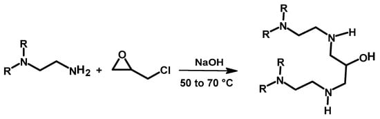 The crosslinking of PEI using ECH to reduce its water solubility and engineer the material’s properties was also studied in the past, and the crosslinked polymer was used for the removal of metal ions and dyes [,,]. Saad et al. prepared crosslinked PEI using ECH in the presence of a NaOH solution at 50–70 °C, which formed a gel like material in few minutes. In this case, the mechanism involves both nucleophilic substitution of the chlorine from ECH and ring opening of the three-membered ring (Scheme 10) []. The metal adsorption characteristic is briefly discussed in Section 3.1 below.