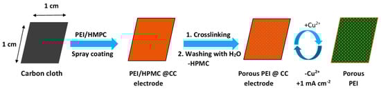 Preparation of the porous PEI@CC electrode and working principle of the reversible copper uptake and electrochemical release, simplified on a segment of a carbon cloth (CC) fiber (figure adapted from ref. []).