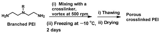 Similar to the crosslinking reaction discussed at −78 and −196 °C (ice templating method), Sahiner et al. crosslinked PEI with glycerol diglycidyl ether (GDE) in excess water at −18 °C [], which resulted a porous structure. The material was used for the direct removal of organic dyes (discussed in Section 3.3).