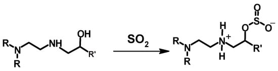Poly(ethylene glycol) diglycidyl ether (PEGDGE, Mn = 500 g/mol) and 1,4-butanediol diglycidyl ether were used as crosslinkers of PEI at low temperature (below 0 °C) (an ice templating technique), as has been described by Narayan et al. (Scheme 5) [] and Chatterjee et al. []. The process of the crosslinking reaction involved the mixing of the PEI and the crosslinker, vortexing, and subsequently freezing the mixture in liquid nitrogen or a dry ice–acetone bath to yield PEI 196 and PEI 78, respectively [], or freezing the mixture at −15 °C []. PEI 196 and PEI 78 are discussed hereafter. The frozen materials were then thawed at room temperature, and the samples were collected carefully from the vial. A SEM study of both materials (PEI 196 and PEI 78) revealed the formation of porous crosslinked materials. The degree of crosslinking was estimated from an XPS study by looking at the ratio of the C-O to C-N bonds in the crosslinked materials. A lower C-O to C-N bond ratio will imply less crosslinking, as the oxygen will come from the crosslinker. The result showed PEI 196 to have a lower C-O to C-N bond ratio and hence a lower degree of crosslinking [], which is expected due to the very low reaction temperature (−196 °C). The better crosslinking reaction of PEI 78 has also resulted a lower percentage of primary and secondary amines in the final material as compared to its counterpart (PEI 196). The materials prepared were used to investigate the adsorption capacity of CO2 and the impact of material exposure to SO2 on the adsorbed CO2. The highly porous crosslinked material showed a high efficiency in CO2 capture, with PEI 196 showing better performance, which could be due to the presence of higher concentrations of primary and secondary amines, among other factors. More discussion on the adsorption of CO2 and effect of SO2 is available in Section 3.4.