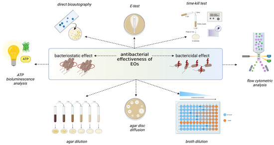 EOs exhibit antibacterial effectiveness (Figure 1) that can be either bacteriostatic (inhibiting bacterial growth and allowing microbial cells to recover reproductive capabilities) or bactericidal (destroying bacterial cells). Various methods can be employed to assess these antibacterial properties, including agar dilution, agar/disc diffusion, broth micro/macro dilution, direct bioautography, antimicrobial gradient method (Etest), time-kill test, adenosine triphosphate (ATP) bioluminescence assays, and flow cytofluorometric analysis [2].