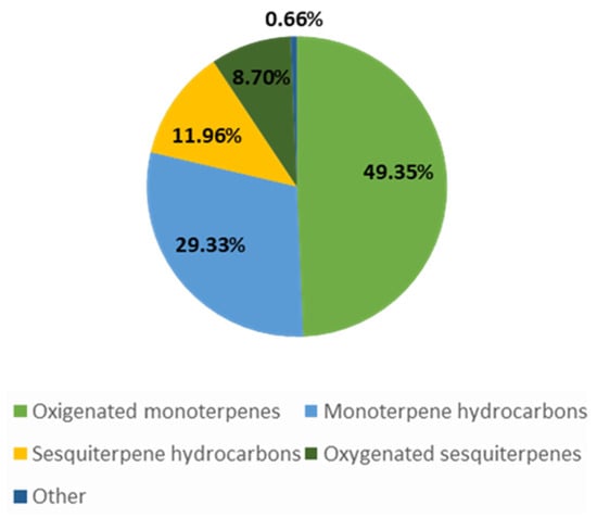 The volatile compounds of H. officinalis L. EO are listed in detail in Table 3. The H. officinalis EO constituents are categorized as oxygenated monoterpenes (27.32–92.25%) [21], monoterpene hydrocarbons (3.84–67.24%) [21], sesquiterpene hydrocarbons (0.64–28.31%) [23,37], and oxygenated sesquiterpenes (0–21.08%) [37]. Figure 2 presents the distribution of these classes.