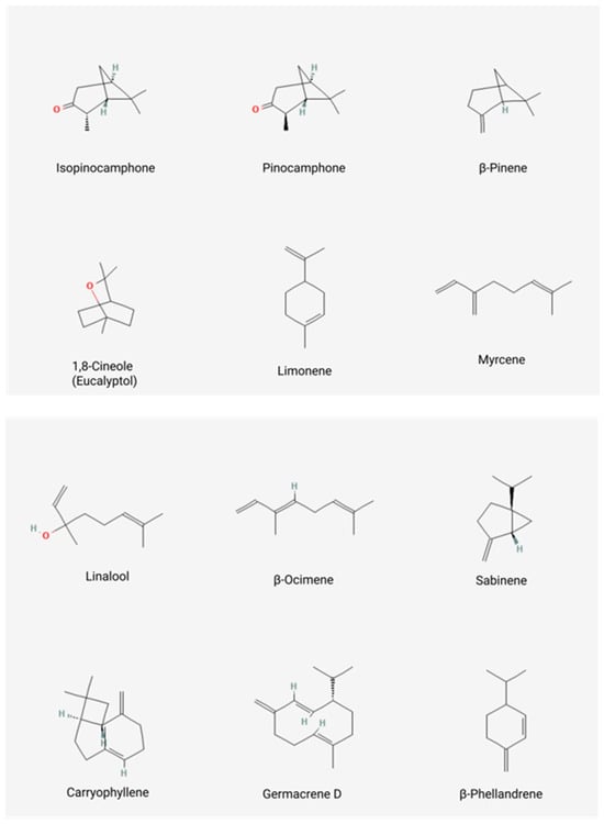 The preponderance of the oxygenated monoterpenes in the oil composition is reflected in its major constituents: 1,8-cineole, isopinocamphone, and pinocamphone. This class is completed by linalool, myrtenol, and borneol, among others. The prominent monoterpene hydrocarbons were β-pinene, β-phellandrene, and β-ocimene, but α-pinene, sabinene, myrcene, and limonene can also be found. The main sesquiterpene hydrocarbons found in H. officinalis EO are β-caryophyllene, germacrene D, bicyclogermacrene, and alloaromadendrene. Spathulenol, caryophyllene oxide, and elemol are the most abundant oxygenated sesquiterpenes. Some authors reported compounds from the phenylpropanoid class, such as methyl eugenol. The chemical structures of the main compounds are presented in Figure 3.