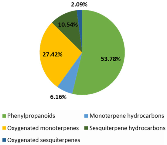 The volatile compounds of A. foeniculm (Pursh) Kuntze EO are listed in Table 4. The EO constituents are categorized as phenylpropanoids, (22.39–84.67%) [17,19], monoterpene hydrocarbons (2.4–10.23%) [19,41], oxygenated monoterpenes (0.08–54.51%) [17,19], sesquiterpene hydrocarbons (1.8–19.19%) [17,41], and oxygenated sesquiterpenes (0.2–3.96%) [17,41]. Figure 4 presents the distribution of these main classes of EO. Also, some researchers reported benzenoid aromatics (approximately 90%) or oxygenated aliphatics.