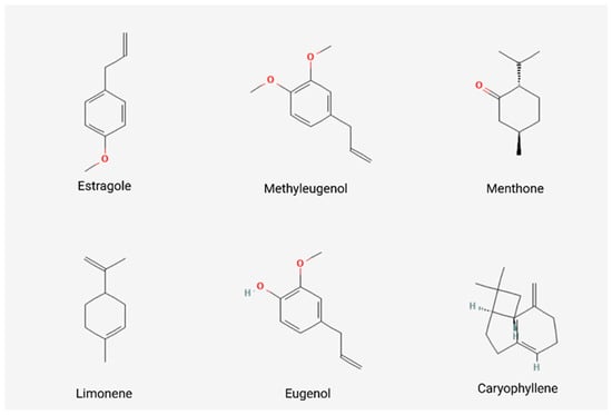 The high amount of phenylpropanoids can be explained through the concentrations of estragole or methyl chavicol (3.2–94.89%) [16,42], methyl eugenol, eugenol, and methyl isoeugenol. Some authors reported a high amount of oxygenated monoterpene menthone (31.58–34.3%) [17,42]. Limonene is the most representative compound (1.5–9.9%) [19,41] from the monoterpene hydrocarbons class; meanwhile, β-caryophyllene is the most common compound from the sesquiterpene hydrocarbon group. Caryophyllene oxide and spathulenol are the most representative of the oxygenated sesquiterpene class. The chemical structures of the main compounds are presented in Figure 5.