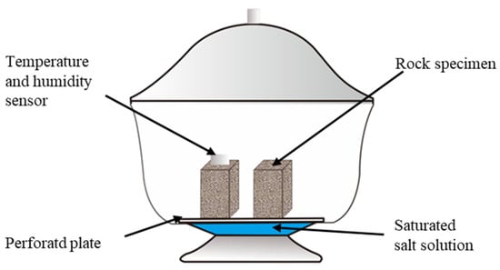 All feldspar sandstone samples were subjected to drying at a constant temperature of 105 °C for 48 h. This is a standard practice commonly used in the field for drying rock samples to ensure complete removal of moisture. After drying, the longitudinal wave velocity of the samples was measured using a ZT802 non-metallic ultrasonic testing analyzer. Fourteen samples exhibiting similar wave velocities were chosen for further physical and mechanical testing. The dried samples were then sealed in plastic wraps, and the masses were recorded of two dried samples, labeled A0-1 and A0-2, kept aside. As shown in Figure 2, the remaining twelve samples were placed in two desiccators, A1 and A2, with six samples in each desiccator. The samples were prepared using a saturated sodium chloride solution with a mass concentration of 26.4%.