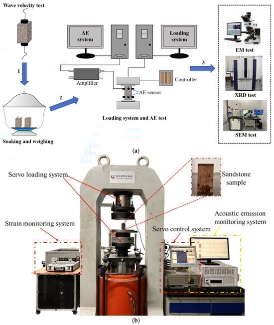 The experimental procedure is illustrated in Figure 4a. The testing equipment includes a P-wave velocity tester, a stress loading system, and an acoustic emission system. To investigate the failure mechanism of sandstone samples, fragments from samples subjected to different immersion times were collected post-loading, labeled, and analyzed using thin-section microscopy, XRD, and SEM tests.