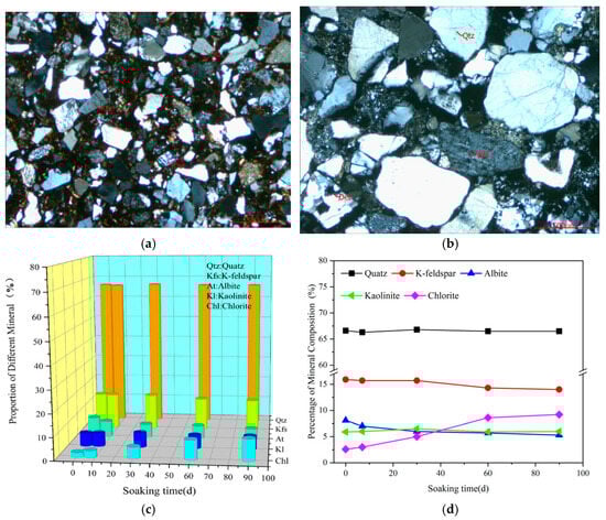 Figure 5a,b show that the sandstone has a blocky structure, with quartz and potassium feldspar clastic particles forming the framework and accounting for 70% of the structure, while clay minerals, as the filling material, account for the remaining 30%. The mineral composition and content of the sandstone samples were then determined using X-ray diffraction, as shown in Figure 5c,d. The dry sandstone comprises total rock minerals: quartz 70%, potassium feldspar 15.9%, amorphous substances 2.2%, albite 0.4%, and clay minerals, such as kaolinite 5.9% and chlorite 0.5%. Over 90 days of immersion, the proportion of total rock minerals decreased by 5.9% compared to the dry state, while the proportion of clay minerals increased.