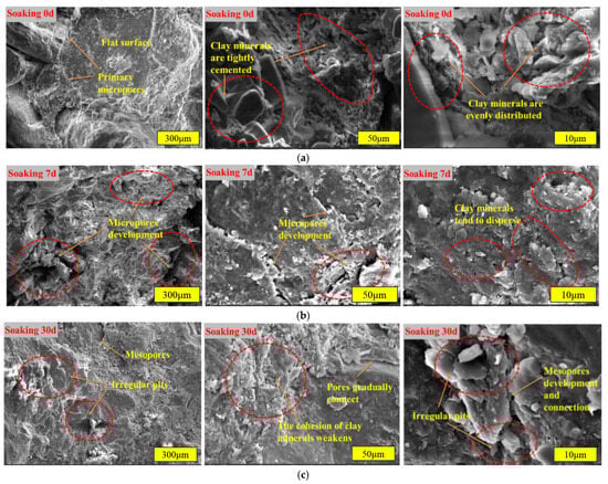 (3) In the SEM images of the sample soaked for 30 days (Figure 6c), the structure of the clay minerals loosens, leading to the formation of penetrative cracks between them. These cracks weaken the connections between particles and allow the cracks to expand and penetrate further.