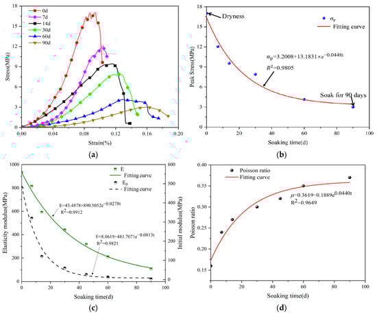Variational patterns of physical and mechanical indicators at different immersion times: (a) stress–strain curves; (b) compressive strength fitting curve; (c) elastic modulus fitting curve; (d) variational trend in Poisson’s ratio.