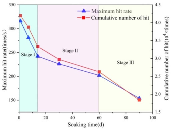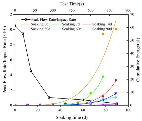 Peak impact rate and cumulative impact count of sandstone at different soaking times.