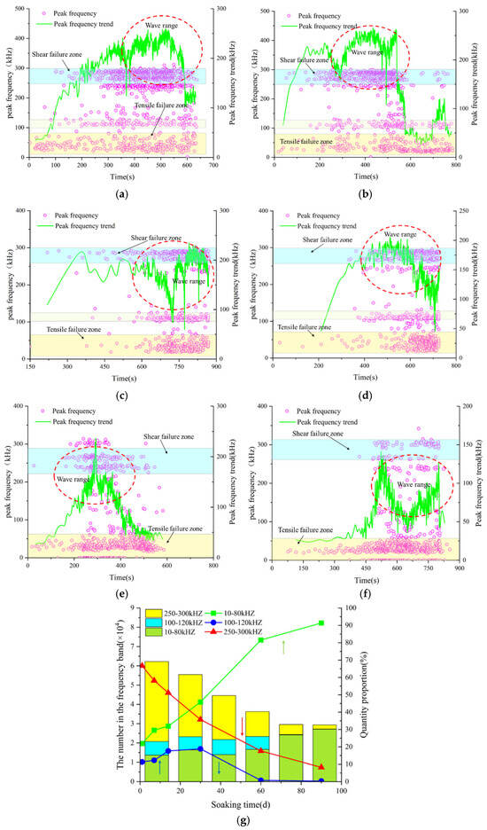 Scatter plots of main frequency versus time for sandstone at different soaking times: (a) dry state; (b) submerged for 7 days; (c) submerged for 14 days; (d) submerged for 30 days; (e) submerged for 60 days; (f) submerged for 90 days; (g) changes in number and proportion of three frequency bands of sandstone over soaking time.