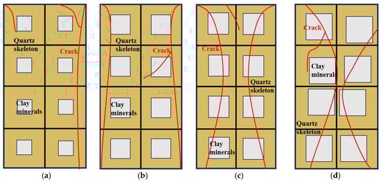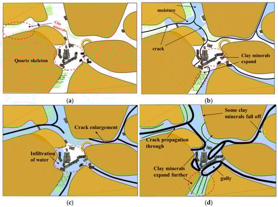 (4) Failure modes based on microscopic mechanisms: According to relevant standards and the experimental results, it can be inferred that clay minerals are relatively uniformly distributed within the quartz framework, as shown in Figure 14a. With increasing soaking time of sandstone, the clay minerals gradually expand. The analyses in (1), (2), and (3) above reveal increasingly irregular expansion, as shown in Figure 14b–d. Additionally, the area of cracks traversing the clay minerals gradually increases, leading to the formation of different failure states. Therefore, the failure modes through microscopic mechanisms offer a strong foundation for the mechanistic analysis presented above.