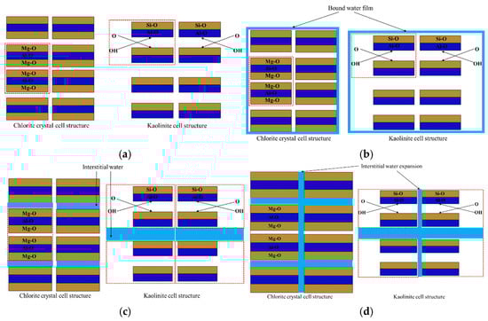 Schematic diagram of intercrystallite structure changes in chlorite and kaolinite: (a) dry state; (b) submerged for 14 days; (c) submerged for 30 days; (d) submerged for 60 days.