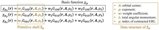 where is a shortened form of the Gauss-type orbital . The primitive ERI is often calculated using recurrence relations such as the McMurchie–Davidson method [31], Obara–Saika method [32], and Head–Gordon–Pople method [33]. In either recursive function, Equation (15) is known to be expandable into a linear combination of a generalized mathematical function called the Boys function [34]: