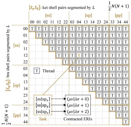 Using the shell data structure, the ERI calculations can be viewed as a task of evaluating primitive ERIs for all elements of an upper triangular matrix indexed by pairs of primitive shells. Figure 2 illustrates the task matrix for ERIs composed of - and -orbitals. We compute all unique ERI values by parallelizing this task matrix on GPUs. Each GPU thread is assigned a unique combination of four primitive shells and sequentially evaluates primitive ERIs within that task. Equation (14) can be implemented by appropriately accumulating the obtained primitive ERIs into the corresponding contracted ERIs. The task matrix can be classified into six integral types as task sub-matrices for - and -orbitals: , , , , , and , through sorting the primitive shell pairs by their total angular momenta . According to the angular momenta, a single task in each sub-matrix has 1, 3, 9, 9, 27, and 81 primitive ERIs, respectively. In GPU parallelization, dedicated CUDA kernels can be developed for these sub-matrices to eliminate warp divergence caused by differences in the angular momenta and contraction degrees K in Equation (14).