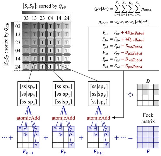 During the SCF procedure, while the molecular integrals and remain constant, the Fock matrix is updated in each iteration according to the density matrix . Equation (21) is computationally demanding not only due to the evaluation of ERIs itself, but also because of the reduction of ERIs into an memory space of the Fock matrix. The efficient implementation of the ERI reduction, particularly using GPUs, is challenging and has been a subject of ongoing discussion in previous research over several years.