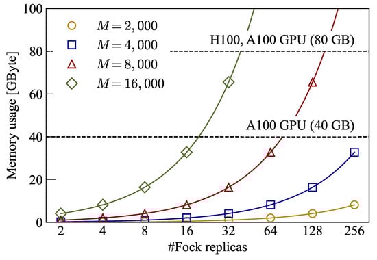 Although additional storage space of in global memory is required, the space complexity increases only by a constant factor, having minimal impact on the size of molecules for which Direct-SCF can be executed on a GPU. Figure 4 shows the additional memory usage required by the proposed replicated Fock matrices. For reference, we consider the memory sizes available on NVIDIA A100 and H100 GPUs. Memory requirements become a significant consideration when handling very large molecules/basis sets with thousands of basis functions M on a single GPU. Assuming double-precision floating-point numbers for the Fock matrix, the memory usage of its replicas can be estimated as [Byte], scaling quadratically with the number of basis functions M. As shown in Figure 4, for , the additional memory usage due to the Fock matrix replication has minimal impact on the computable molecular size. For , the number of replicas becomes somewhat limited. Considering the memory required for other matrices involved in the SCF procedure, the upper limits for the number of replicas can be estimated as for and for M = 16,000. Nevertheless, the experimental results in Section 5 show that sufficient speedup can be achieved with the proposed method even with a small number of Fock replicas.