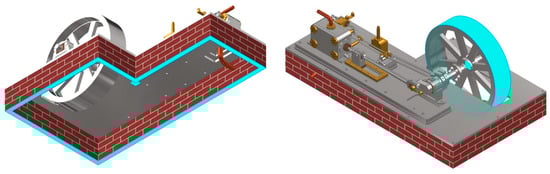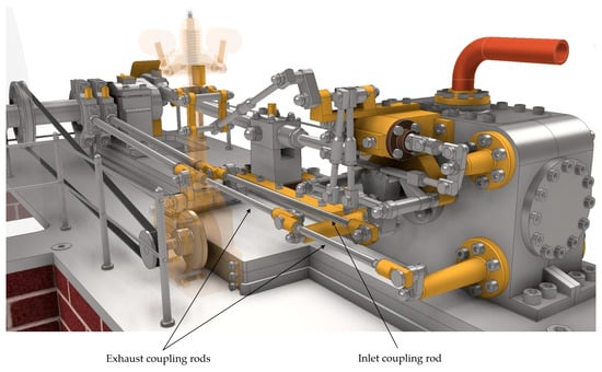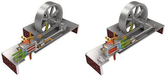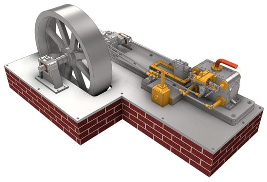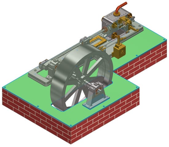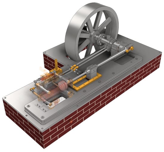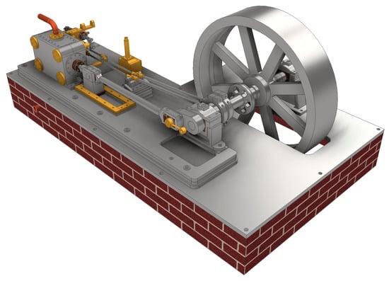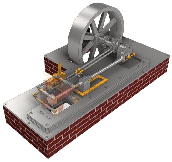 Specifically, this study focuses on the investigation of a historical invention by Arnold Throp, published in the magazine Model Engineer in 1982 [9,10], the plans of which were reproduced by Julius de Waal in 2018 [11]. This historical invention has been recently analyzed by the authors from a design perspective [12], detailing the Corliss valve gear employed in this engine, as there is a lack of available information regarding the invention’s operation (steam pressures during admission) and design.